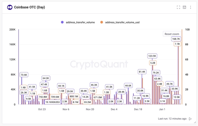 11일 주기영 크립토퀀트 대표는 엑스(옛 트위터)를 통해 "이날 코인베이스에서 OTC 거래를 통해 전송된 비트코인은 70억달러 규모를 기록하며 지난 1년간 최고치를 찍었다"라고 밝혔다.