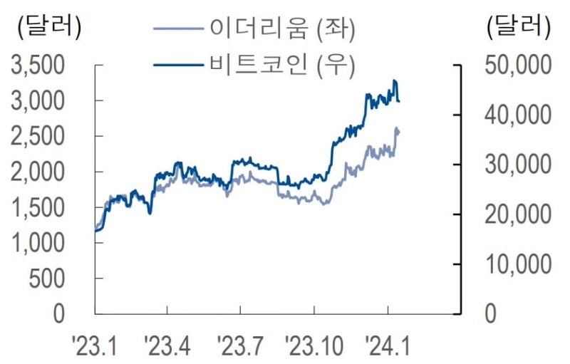 한편 이더리움 현물 ETF 승인 가능성에 대해선 유보적 입장을 보였다. 홍 연구원은 "이더리움 현물 ETF가 곧 등장할 수 있다는 예상들이 있지만, 아직 이더리움 현물 ETF에 대해 미국 SEC가 입장을 밝힌 바 없다"며 "이번 비트코인 현물 ETF 승인은 증권성이 없는 원자재인 비트코인에 국한된 판단이라고 SEC 의장이 거듭 강조했다"고 밝혔다.