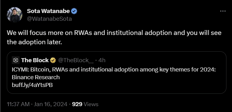 16일(현지시간) 소타 와타나베는 자신의 X(옛 트위터)에서 "우리는 RWA와 기관 채택에 더 중점을 둘 것"이라고 밝혔다.