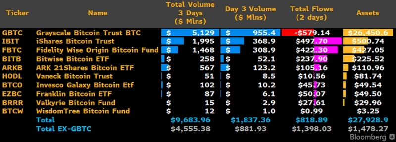 그레이스케일을 포함한 비트코인(BTC) 현물 ETF 10종의 3일간 거래량이 100억달러에 근접한 것으로 드러났다.
