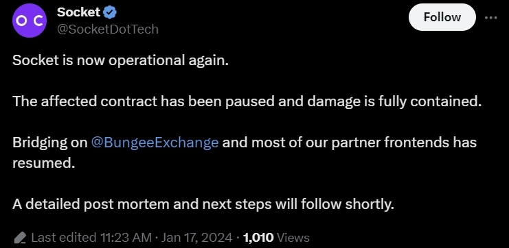 17일(현지시간) 블록체인 상호 운용성 프로토콜 소켓은 공식 X(옛 트위터)를 통해 "소켓 프로토콜 재가동을 시작했다"고 밝혔다. 이어 소켓은 "익스플로잇 영향을 받은 컨트랙트는 일시 중지됐고, 피해는 완전히 복구됐다. 이에 따라 번지익스체인지를 비롯한 대부분의 파트너사 프론트엔드에서 브릿징 서비스가 재개됐다"고 전했다.