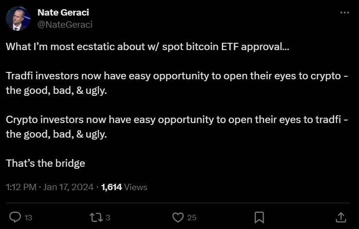 17일(현지시간) 네이트 제라시(Nate Geraci) ETF스토어 최고경영자(CEO)는 X(옛 트위터)를 통해 "비트코인 현물 ETF 승인은 전통 금융 투자자와 가상자산 투자자 모두에게 좋은 기회를 제공한다"고 말했다.