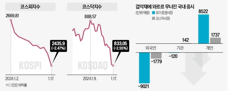 코스피지수가 2% 이상 급락하며 2430선까지 밀렸다. 국내외 지정학적 불안, 외국인과 기관의 매도 공세, 기업 실적 악화 등의 악재가 겹친 탓이다. 정부가 국내 증시를 띄우기 위해 각종 혜택을 발표했지만 냉랭한 투자심리를 돌이키진 못했다.