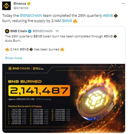 글로벌 가상자산(암호화폐) 거래소 바이낸스가 17일(현지시간) 공식 X(구 트위터)를 통해 제26차 바이낸스코인(BNB) 정기 소각을 통해 총 214만1487BNB를 소각했다고 발표했다. 이는 약 6억3000만달러 규모다.