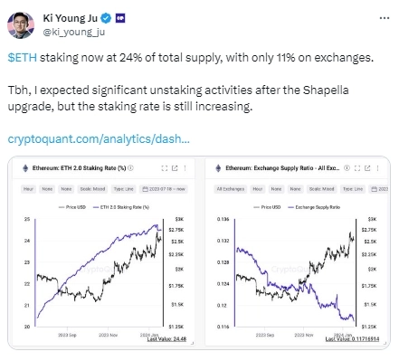 그는 "지난해 ETH 언스테이킹 기능을 활성화시킨 샤펠라(Shapella) 업그레이드 이후에도 스테이킹 비율은 여전히 상승하고 있다"고 설명했다.