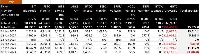 미국에서 비트코인(BTC) 현물 상장지수펀드(ETF)가 지난 10일 승인된 이후 5거래일 동안 그레이스케일의 GBTC에서 5만 BTC가 유출된 것으로 나타났다.