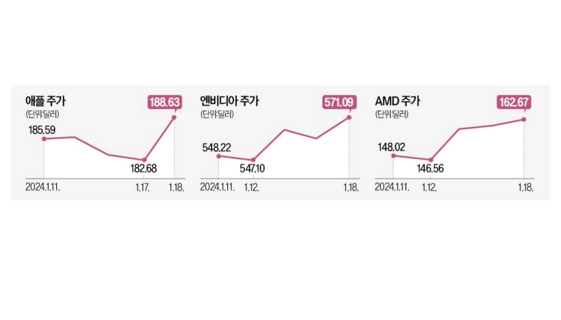 글로벌 투자자는 18일(현지시간) 인공지능(AI) 반도체 수요에 대한 긍정적인 보고서와 기업 실적에 기다렸다는 듯이 반도체 관련 기술주를 사들였다. 기술주 중심의 나스닥지수는 지난해 말 산타 랠리 이후 차익 거래로 잠시 주춤하는 모습을 보였지만 이날 하루 만에 상승폭 1.35%를 기록하는 저력을 보였다. 애플과 엔비디아, AMD가 전체 나스닥지수를 이끌었고, TSMC의 AI 반도체 실적 호조도 힘을 보탰다.