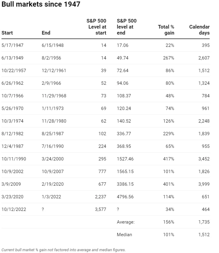 CFRA 데이터에 따르면 시장은 추가 상승할 것으로 예상됩니다. 1947년 이후 강세장은 평균 1700일 이상, 즉 4년 이상 지속합니다. 중앙값도 1500일이 넘습니다. 이 이간 평균 156%, 중앙값 기준 101% 올랐습니다. 이번 강세장은 2022년 10월부터 따져 약 15개월 동안 지속하였고 현재까지 상승률은 34%입니다.