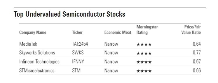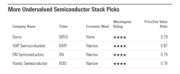 모닝스타는 펀더멘털이 좋지만, 아직 저평가된 반도체 주식으로 미디어텍(대만), 스카이웍스 솔류선, 인피니온, ST마이크로 등을 추천했습니다. 또 가장 저평가된 주식으로는 코르보, NXP반도체, ON세미, 노르딕 반도체를 추천했습니다.