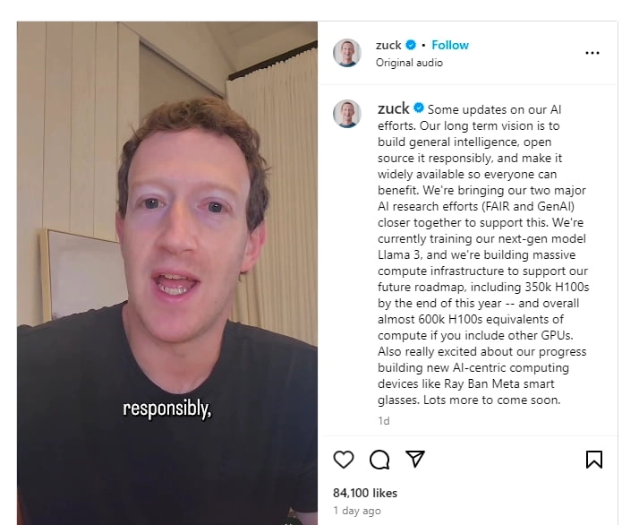 메타의 마크 저커버그 CEO가 어제 인스타그램을 통해 AI 장기 비전을 위해 올해 말까지 해 올해 말까지 엔비디아의 최첨단 GPU 칩인 H100 35만 개를 포함한 ”대규모 컴퓨팅 인프라”를 구축하고 있다고 밝혔습니다. 저커버그는 이미 몇 개를 샀는지 밝히지 않았지만, H100은 2022년 말 출시되었고 지난해 품귀 현상을 빚었습니다. 현재 개당 2만5000\~3만5000달러에 팔리는데요. 메타가 3만 달러에 35만 개를 산다면 100억 달러 이상을 투입하는 것입니다. 저커버그는 게다가 ”다른 GPU를 포함하면 거의 H100 60만 개에 해당하는 컴퓨팅”이 만들고 있다고 썼습니다. 메타는 지난 3분기 실적 발표에서 컴퓨팅 인프라 확장으로 2024년 총비용이 940억\~990억 달러에 이를 것이라고 밝힌 바 있습니다.