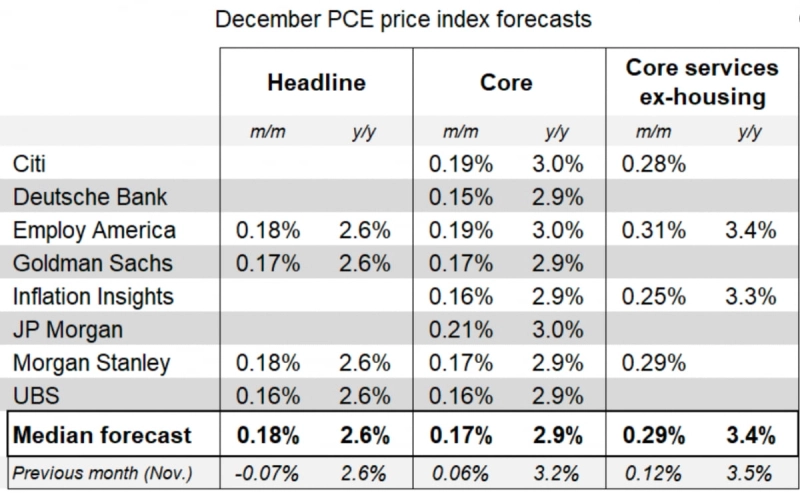다음주 26일에 12월 개인소비지출(PCE) 물가가 나오면 다시 인플레이션이 확실히 둔화하고 있다는 믿음이 강해지면서 금리 인하 기대가 되살아날 것이라는 관측도 이어지고 있습니다. 월가 컨센서스는 헤드라인 및 근원 PCE 물가 모두 12월에 전월 대비 각각 0.2%씩 상승하는 것입니다. 전년 대비로는 각각 2.6%, 2.9%로 보고 있습니다.