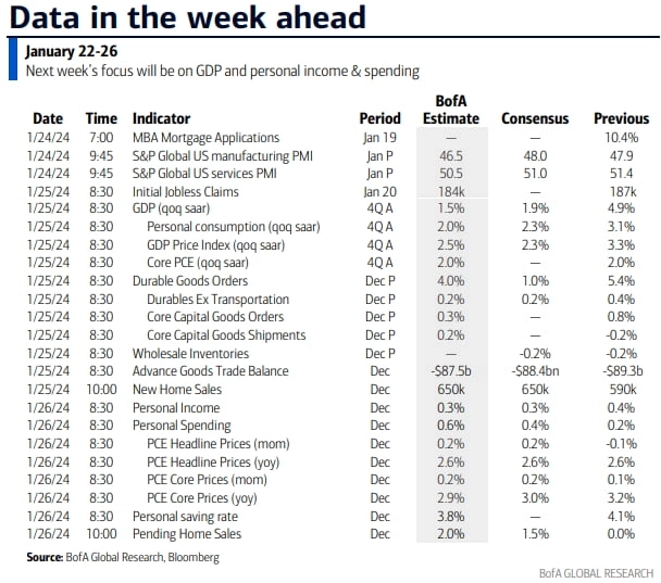 다음주 25일에는 4분기 국내총생산(GDP) 성장률 속보치도 발표됩니다. 월가 컨센서스는 연율 2.0%입니다. 3분기 4.9%보다는 낮아지는 것이지만, 여전히 강력한 수치입니다. 만약 이보다 높게 나오면 금리 인하 기대는 뒤로 밀릴 수 있습니다. 웰스파고는 "연말 데이터는 2023년 말 대단한 성장에 대한 우리의 견해를 뒷받침한다"라면서 1.7% 상승을 예상했습니다. 그렇게 되면 2023년 연간 성장률은 2.4%가 될 것입니다.