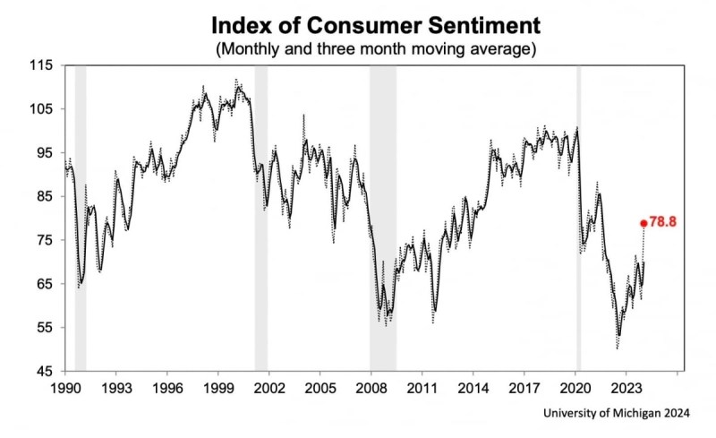 RSM은 "급격한 정서 개선은 소비자의 지속적 힘을 시사하며 앞으로 몇 달 안에 더 많은 지출을 뒷받침할 것이다. 최근 경제 데이터가 얼마나 강력한지 고려할 때, 인플레이션 기대가 잘 고정된 소비자심리지수는 연착륙을 기대할 수 있는 더 많은 이유"라고 분석했습니다.