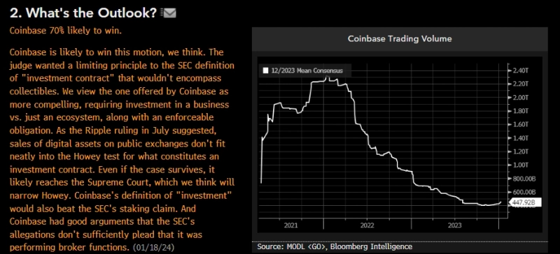지난 21일(현지시간) 더블록이 인용한 엘리엇 스테인(Elliott Stein) 블룸버그 애널리스트 분석에 따르면 코인베이스는 미국 증권거래위원회(SEC)와의 소송에서 이길 확률이 높은 것으로 분석된다.