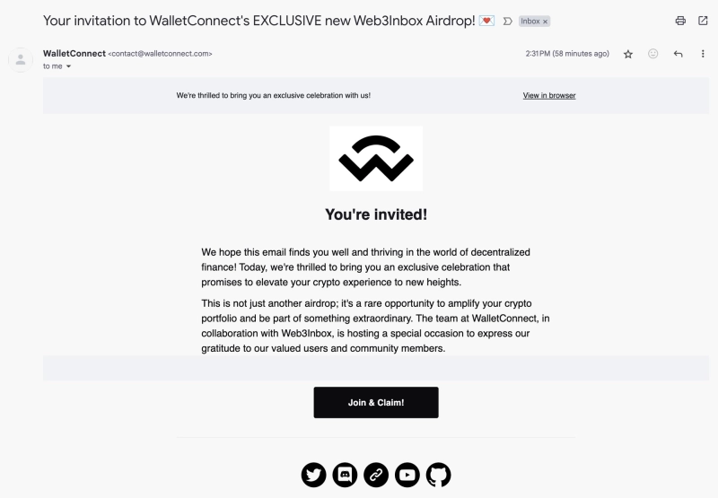 이에 월렛커넥트는 공식 X(트위터)를 통해 "에어드랍을 신청하라는 내용의 사칭 이메일이 돌고 있는 것을 인지하고 있다"라며 "이는 월렛커넥트는 물론, 월렛커넥트의 관계사 어느곳과도 연관이 없다"라고 밝혔다.