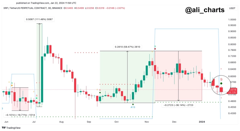 이와 관련해 가상자산(암호화폐) 분석가 알리 마르티네즈는 23일(현지시간) 자신의 X(옛 트위터)에 "지난 3일간의 차트에서 매수 신호가 발견된 후 하락세를 보였다"며 "리플이 반등을 준비하고 있을 수도 있다"고 말했다.