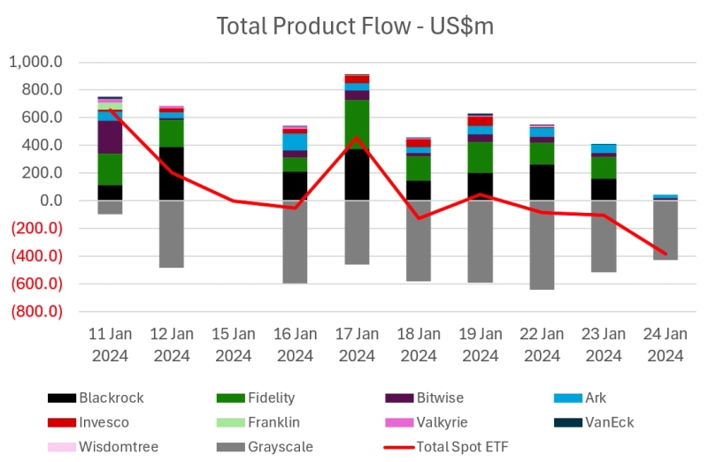 다만 에릭 발추나스 블룸버그 ETF 분석가는 이날 자신의 X에 "겉보기에 GBTC 유출량은 감소하고 있는 것으로 보인다. 하지만 확실하지 않은 것들이 너무 많다"고 밝혔다.
