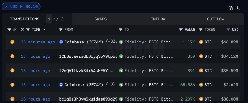 코인베이스 등 거래소에서 피델리티 비트코인(BTC) 현물 상장지수펀드(ETF) 주소로 1170 BTC이 전송된 것으로 나타났다.