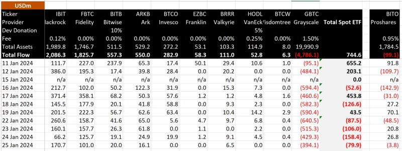 미국에서 비트코인(BTC) 현물 상장지수펀드(ETF)가 지난 11일(현지시간) 상장된 이후 10거래일 동안 총 7억4460만달러(약 9959억원)의 자금이 순유입된 것으로 나타났다.