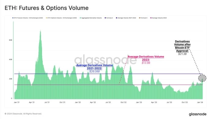 글래스노드는 "현재 이더리움 파생상품의 일일 총 거래량은 213억달러를 기록하고 있다"면서 "이는 2023년 평균 거래량(139억달러)를 웃돌지만 2021년, 2022년 거래량에는 한참 미치지 못했다"라고 덧붙였다.
