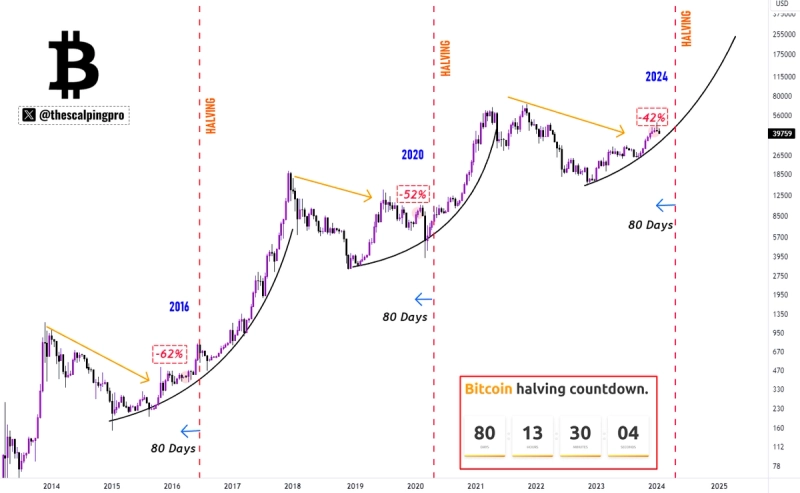 23일(현지시간) 가상자산(암호화폐) 분석가 'Mags'는 자신의 X(옛 트위터)를 통해 "비트코인의 가격은 반감기 80일전에 항상 하락세를 보였다"면서 이같이 밝혔다.