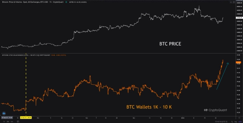 27일 가상자산(암호화폐) 분석 플랫폼 크립토퀀트(CryptoQuant)의 엘크립토타보(elcryptotavo) 분석가는 퀵테이크 리포트를 통해 "비트코인을 1000개 이상 1만개 이하 보유한 '큰 손' 고래 투자자들이 계속해서 비트코인을 축적하고 있다"라고 밝혔다.