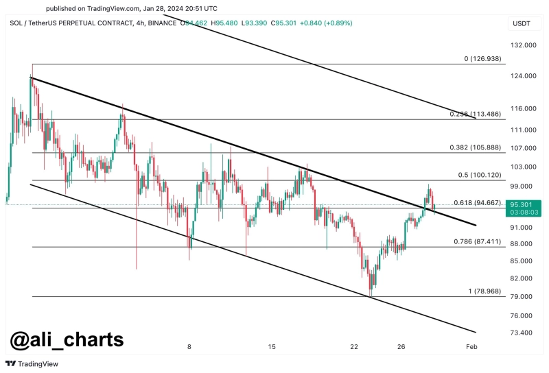 29일(현지시간) 가상자산(암호화폐) 분석가 알리 마르티네즈(Ali Martinez)는 X(옛 트위터)를 통해 "솔라나가 하락 채널에서 빠져나온 것으로 보인다. 94달러 이상을 유지할 수 있다면, 113달러까지 상승할 것으로 보인다"고 전했다.