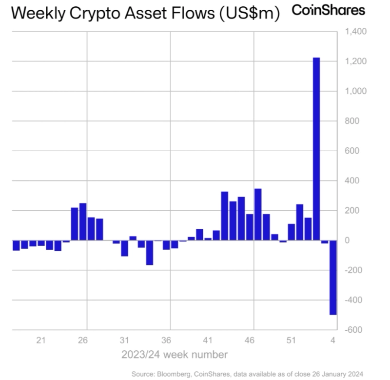 29일(현지시간) 가상자산 운용사 코인쉐어스는 '주간 디지털 자산 상품 자금 흐름' 보고서를 통해 "지난주 글로벌 디지털 자산 투자 상품에서 총 5억달러 규모의 자금 유출이 발생했다"라고 전했다.