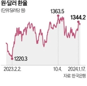 한국은행에 따르면 원·달러 환율은 지난해 마지막 거래일인 12월 28일 1288원에 거래를 마쳤다. 하지만 새해 들어선 급등세를 보였다. 1월 첫 거래일인 2일엔 1300원40전을 기록하더니 보름 뒤인 17일엔 1344원20전까지 치솟았다. 이후 1330원대로 내려온 원·달러 환율은 지난달 25일 기준 1335원80전에 거래를 마쳤다.