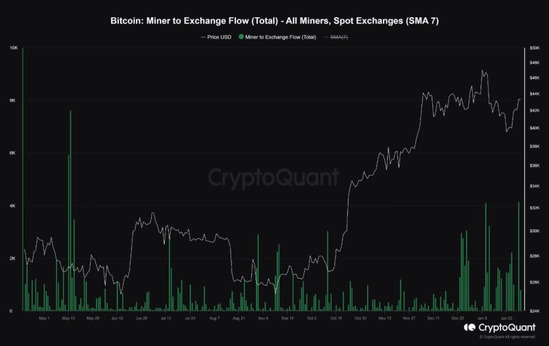 31일(현지시간) 온체인 분석 플랫폼 크립토퀀트(CryptoQuant)는 공식 X(트위터)를 통해 "어제 채굴자 지갑에 있는 4000BTC가 현물 거래소로 입금됐다. 이는 지난 2023년 5월 16일 이후 최대치로, 약 1억7300만달러에 달한다"라고 전했다.