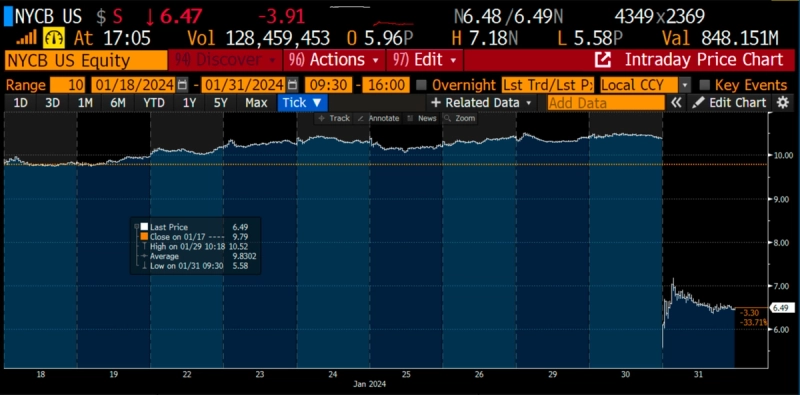 그는 "최근 10년물과 2년물의 수익률이 급락했다. 이는 시장이 부실한 금융권의 상황을 해결하기 위한 구제금융을 기대하고 있다는 신호"라면서 "뉴욕 커뮤니티 뱅코프(NYCB)가 '깜짝 손실'을 기록했다. 새로운 구제 금융이 나올 것으로 예상된다"고 설명했다.