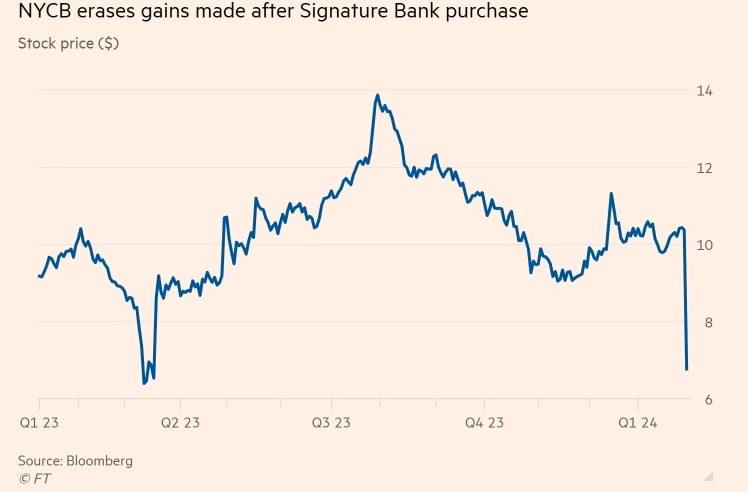 미국 뉴욕 교외에 위치한 지역은행 뉴욕커뮤니티뱅코프(NYCB) 주가가 하루 만에 38% 폭락했다. 상업용 부동산 시장 침체 여파로 대출 손실이 급증하면서다. 작년 3월 미 ‘은행 위기’ 당시 파산한 시그니처은행을 사들인 이후 대손 충당금도 눈덩이처럼 불어났다. 지역은행 위기가 재점화되는 것 아니냐는 우려가 나온다.