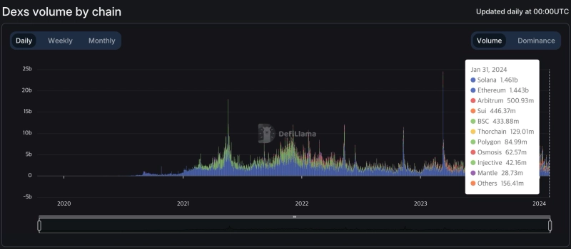 이는 최근 자체 토큰의 에어드랍 및 상장을 발표한 솔라나 기반 DEX '주피터(JUP)'의 영향인 것으로 풀이된다. 주피터는 이날 12억달러 이상의 일일 거래량을 기록했다.