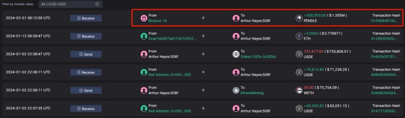 아서 헤이즈 비트멕스 창립자의 소유로 추정되는 지갑 주소가 바이낸스 거래소에서 50만 펜들(PENDLE)을 출금한 것으로 나타났다. 이는 126만달러(약 16억원) 규모다.