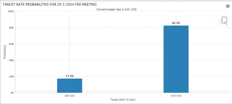 이날 23시 기준 시카고상품거래소(CME) 페드워치에 따르면 Fed가 오는 3월에 금리를 인하할 확률은 17.5%로 반영됐다. 금리 인하 가능성은 종전의 40%대에서 다소 하락했다. 페드워치는 3월 Fed가 기준금리를 동결할 가능성을 82.5%로 전망하고 있다.