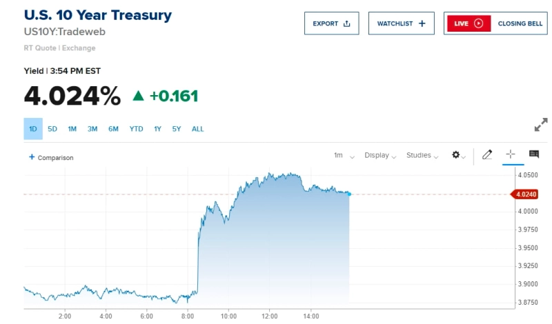 뉴욕 채권 시장에서 오후 3시 55분께 국채 2년물 수익률은 17.8bp 오른 4.372%, 10년물은 16.1bp 상승한 4.024%에 거래됐습니다. 1월 고용보고서 발표 직후 큰 폭으로 치솟았고, 오전 10시 미시간대 소비자심리지수가 예비치보다 더 높아진 것으로 나온 뒤 조금 더 올랐습니다. 소비자심리지수(확정치)는 77.1로 12월 67.4뿐 아니라 1월 예비치 78.8보다 높아졌습니다. 1년 기대인플레이션은 2.9%(12월 3.1%)로 예비치와 같았고, 5년 기대인플레이션도 2.9%로 나타났습니다.