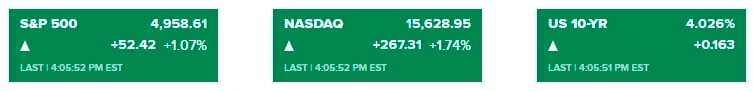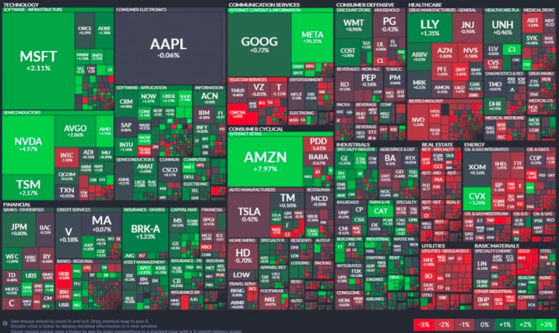메타가 20.35% 뛰었고 아마존은 7.97% 상승했습니다. 메타의 경우 2022년 11월에 주당 88달러까지 떨어졌었는데, 오늘 하루 주가 상승 폭이 80달러를 넘었습니다. 마이크로소프트는 2.11% 올랐고, 엔비디아는 4.97% 뛰었습니다. 알파벳은 0.72% 상승했고요. 하지만 애플은 0.06% 약보합세로 마감했고 테슬라는 0.42% 내렸습니다. 애플은 한때 4% 넘게 내리기도 했습니다.