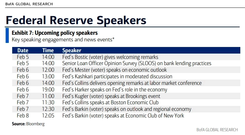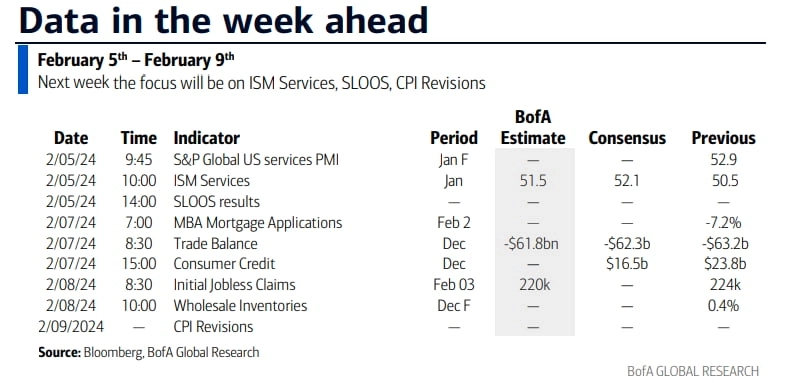 월요일에 나오는 ISM 서비스 PMI가 중요합니다. 지수는 12월에 50.5로 2포인트 하락해 2023년 최저 수준으로 떨어졌습니다. 하락의 주요 원인은 고용 구성 요소가 7.4포인트 급락하여 최저 수준인 43.3으로 하락한 것입니다. 예상(51.0)이나 11월(50.7)보다 훨씬 낮았죠. 1월 고용보고서가 잘못되었느니 여러 가지 논란이 있는 상황에서 서비스 고용이 낮은 수준을 유지할 경우 시장에서 3월 인하 희망이 다시 나올 수 있습니다. 월가는 헤드라인 ISM 서비스 지수는 52.0으로 서비스 부문의 지속적인 강세를 입증할 것으로 예상합니다.