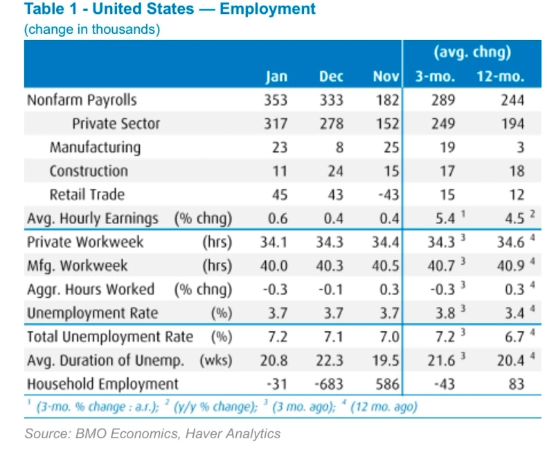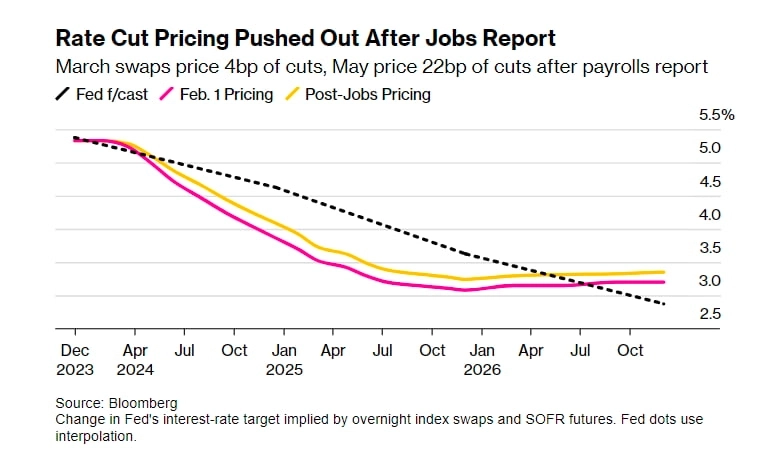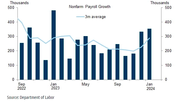 웰스파고는 "고용 시장은 점점 더 견고한 기반에 있는 것으로 보인다. 1월에는 탄탄한 고용 증가 외에도 산업 전반에 걸쳐 고용 증가 폭이 확대되었고 평균 시간당 소득 증가율도 예상의 두 배에 달했다. 오늘 고용보고서는 3월 금리 인하가 불가능하다는 시각을 뒷받침한다"라고 설명했습니다.