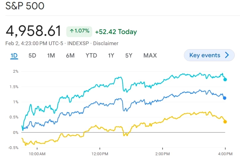 2일(미 동부시간) 아침 미국의 1월 고용보고서가 발표되자 모두 깜짝 놀랐습니다. 통계 잘못, 조작을 거론할 정도로 믿기 어려운 뜨거운 고용 데이터였습니다. 금리는 폭등했고 미 국채 10년물 수익률은 다시 4%를 돌파했습니다. 시장의 3월 금리 인하 기대는 거의 사라졌습니다. 그래도 뉴욕 증시는 또 올랐고 S&P500 지수는 사상 최고 기록을 또 다시 갈아치웠습니다. 메타가 20% 넘게 오르는 등 AI 중심의 빅테크가 시장을 굳건히 지켰습니다.