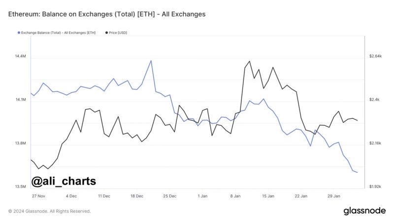 지난 4일(현지시간) 가상자산(암호화폐) 분석가 알리 마르티네즈(Ali Martinez)는 X(옛 트위터)를 통해 "주요 가상자산 거래소에서 지난 3주 동안 51만 ETH이 출금됐다"라고 밝혔다.