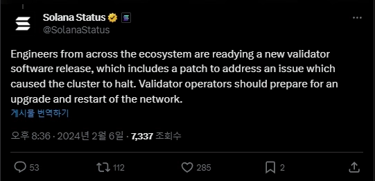 6일(현지시간) 솔라나는 솔라나 스테이터스 X(트위터)를 통해 "생태계 엔지니어들이 클러스터 중단 문제를 해결하기 위한 유효성 검사기 소프트웨어 패치 배포를 준비하고 있다. 검증인 운영자들은 네트워크 업그레이드와 서버 재시작을 준비해야 한다"라고 전했다.