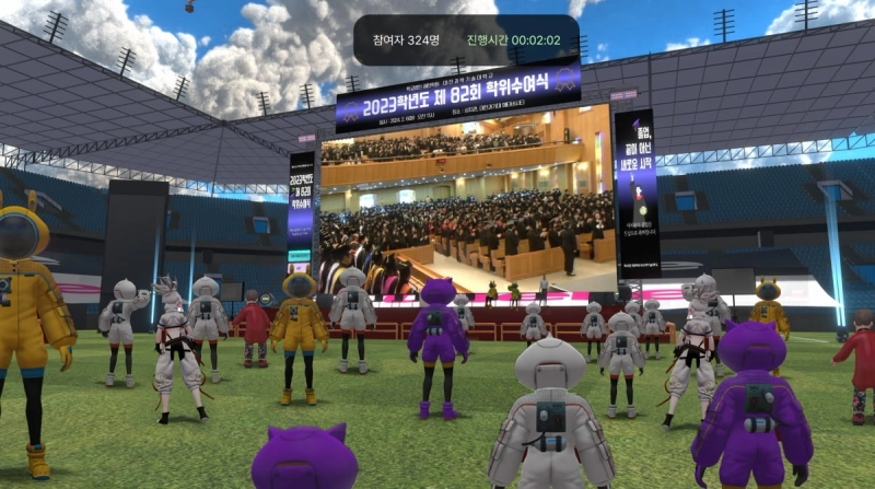 지난 6일 열린 대전과학기술대 학위수여식. 가상 캠퍼스 정문 앞에 행사를 알리는 현수막이 휘날렸다. 광장에 입장하자 오프라인으로 진행 중인 졸업식이 전광판에 실시간으로 중계됐다. 현장에 참석 못한 학생과 가족 아바타들이 중계를 보며 손뼉을 쳤다.
