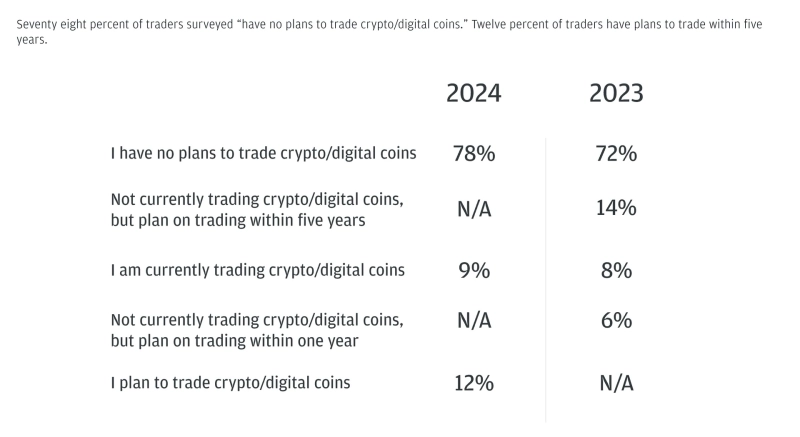 기관 트레이더의 약 80%가 5년 내 가상자산(암호화폐)를 거래할 계획을 가지고 있지 않다는 설문조사 결과가 나왔다.