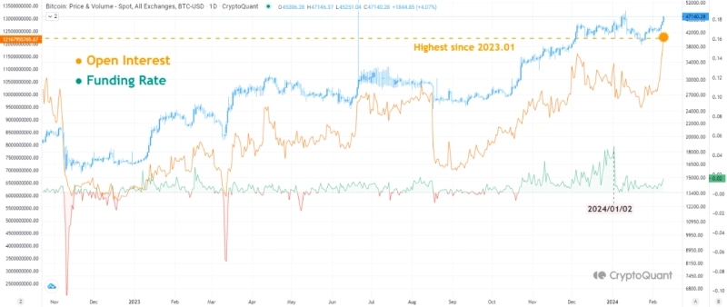 10일 가상자산(암호화페) 분석 플랫폼 크립토퀀트(CryptoQuant)의 연세_덴트(Yonsei_dent) 분석가는 퀵테이크 리포트를 통해 "비트코인은 지난 4일 동안 12% 넘게 상승했고 미결제약정(OI)은 지난해 1월 이후 최고치를 기록했다"면서 "비트코인에 대한 투자자의 관심이 지속적으로 증가하고 있다"라고 밝혔다.