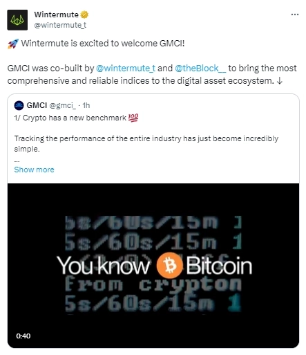 가상자산(암호화폐) 마켓메이커 윈터뮤트가 12일(현지시간) 공식 X(구 트위터)를 통해 가상자산 전문 미디어 더블록과 협력해 가상자산 지수 제공업체인 GMCI를 출시했다고 발표했다.