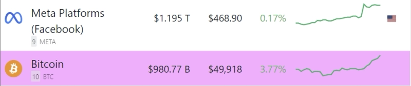 13일(현지시간) 코인텔레그래프에 따르면 비트코인은 시가총액 9800억을 훌쩍 넘으면서 시총 기준 상위 자산 10위에 등극했다. 비트코인 바로 위에는 메타가 자리잡고 있으며, 약 1조2000억원의 시총을 기록하고 있다.