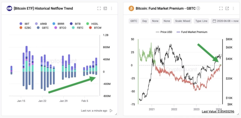 최근 GBTC 유출 규모가 감소하고 코인베이스 프리미엄도 양수로 바뀌면서 비트코인이 상승할 것이란 분석이 나온다.