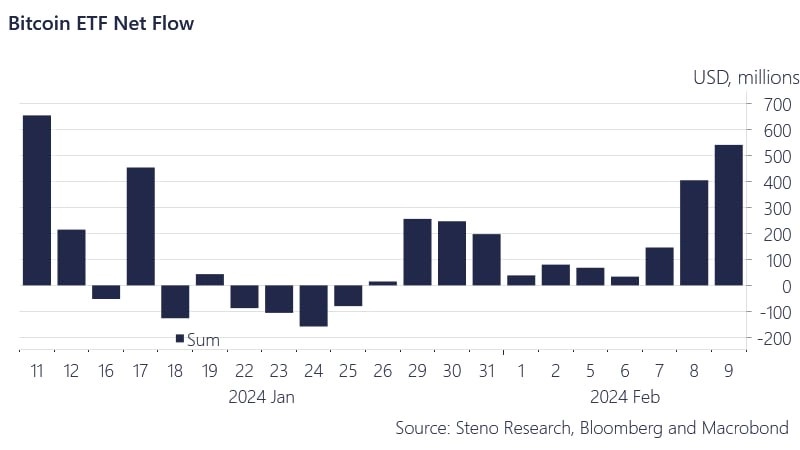 13일(현지시간) 크립토퀀트 저자 MadsEberhardt_Steno에 따르면 지난주 목요일과 금요일 이틀 동안 10억달러 상당의 자금이 비트코인 현물 ETF로 순유입됐다.