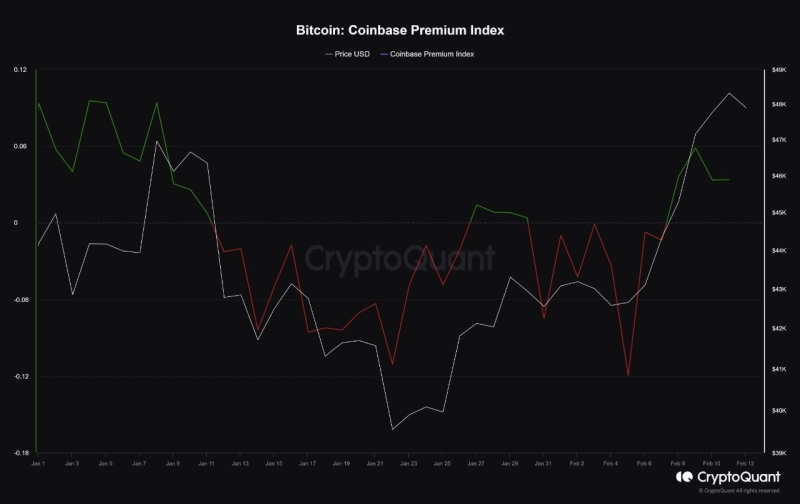 코인베이스 프리미엄 지수가 상승한 것에 대해 비트코인 현물 ETF에 대한 대량 유입이 영향을 미쳤다는 분석이 나왔다.